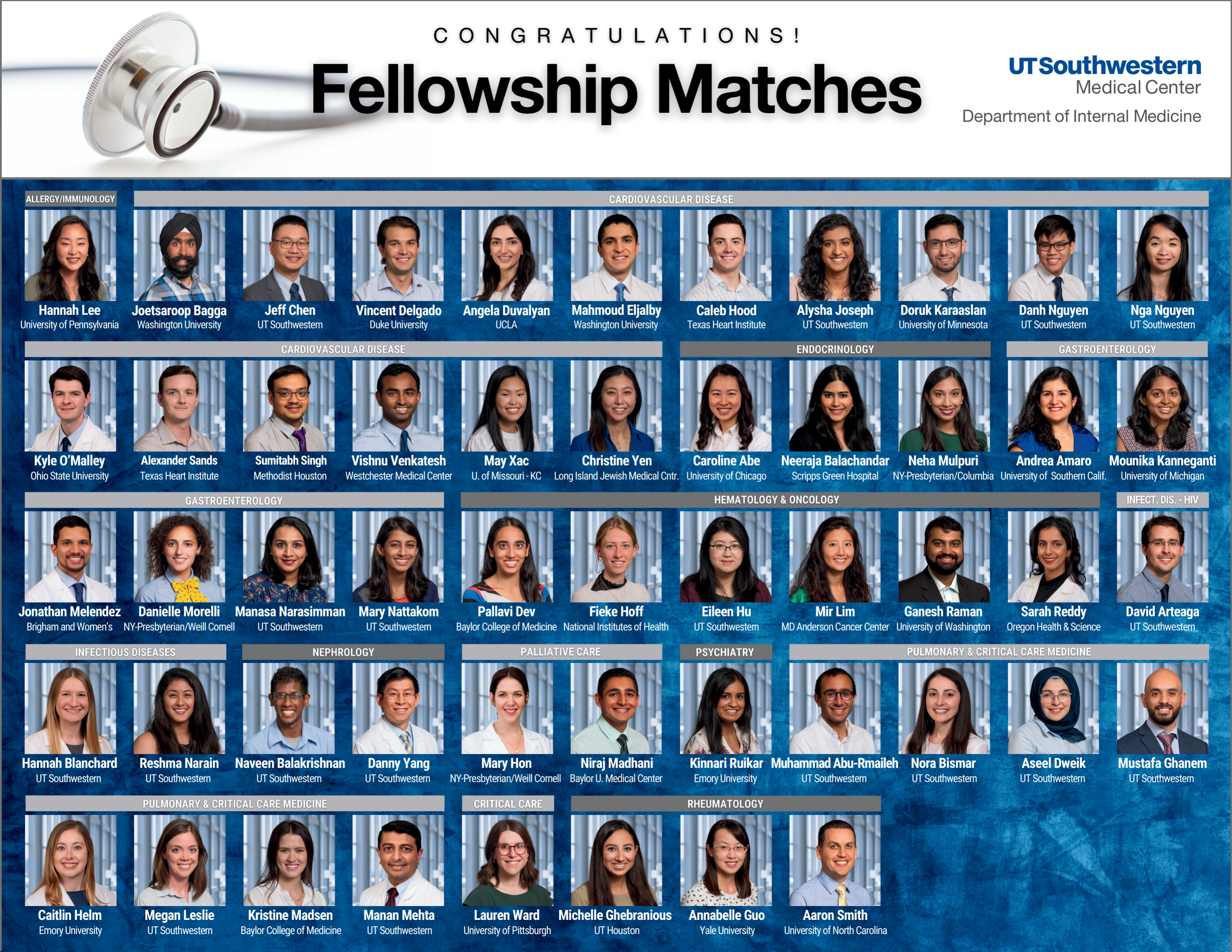 Resident Physicians Match in Chosen Fellowship Programs Image Posted on December 3, 2023 by jongarinn Share this: Share on X (Opens in new window) X Share on Facebook (Opens in new window) Facebook Share on LinkedIn (Opens in new window) LinkedIn Like Loading... Related